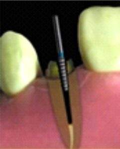 •         Fotopolimerizar longamente através do pino e das linhas de cimento. Se usar um cimento tipo CORE, como o Superpost Core Cement, pode construir o núcleo com o próprio material, pois ele tem resistência mecânica suficiente.
