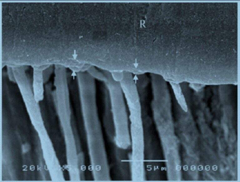 Imagem mostrando a penetração de um adesivo dentro dos canalículos, promovendo embricamento mecânico e aumentando a retenção.